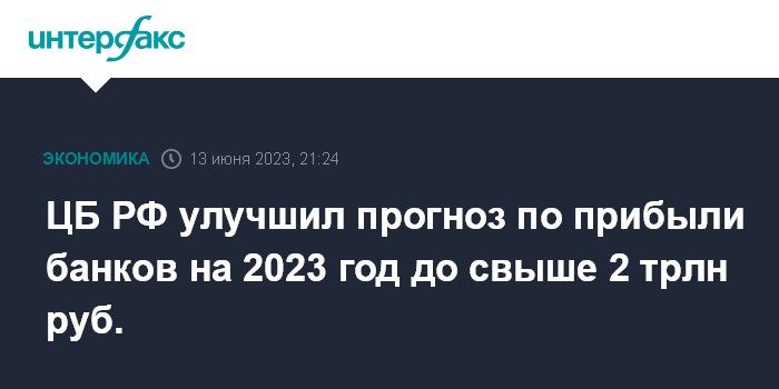 Москва. 13 июня. INTERFAX.RU - Российские банки в 2023 году могут заработать свыше 2 трлн рублей прибыли, что больше предыдущих оценок ЦБ, прогнозировавшего ранее финансовый результат в пределах 1,5 трлн рублей, говорится в сообщении на сайте Банка России.