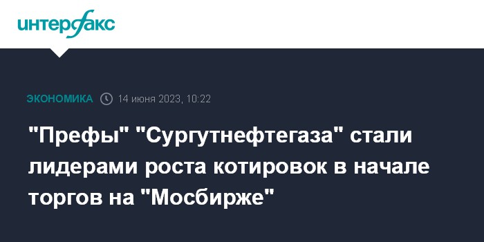 Москва. 14 июня. INTERFAX.RU - В среду торги на российском рынке акций открылись продолжением роста цен большинства blue chips на фоне позитивных сигналов с внешних площадок на ожиданиях паузы в ужесточении монетарной политики ФРС США, а также в преддверии новостей с ПМЭФ, лидируют в росте "префы" "Сургутнефтегаза" на фоне ослабления рубля.