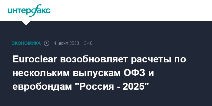 Москва. 14 июня. INTERFAX.RU - Euroclear возобновляет расчеты по нескольким выпускам облигаций федерального займа (ОФЗ) и суверенным еврооблигациям РФ в евро с погашением в 2025 году, сообщается в обзоре аналитиков "Ренессанс Капитала".