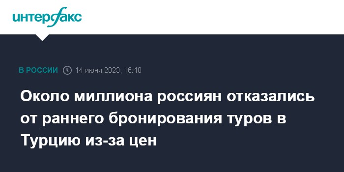 Москва. 14 июня. INTERFAX.RU - Около миллиона российских туристов отказались от раннего бронирования туров в Турцию из-за повышения цен, но по итогам года страна все равно останется наиболее популярной среди зарубежных направлений, сообщил журналистам вице-президент "Альянса турагентств" Алексан Мкртчян.