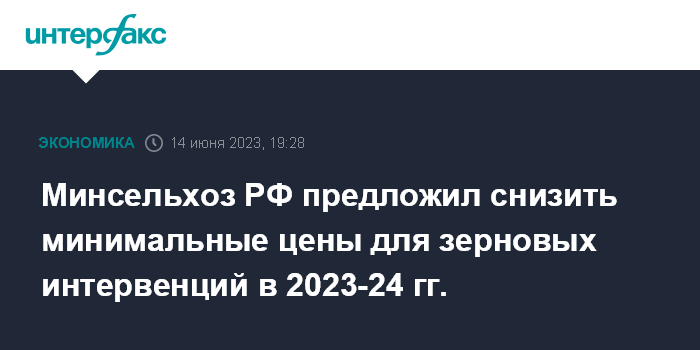 Москва. 14 июня. INTERFAX.RU - Минсельхоз РФ предлагает изменить предельные минимальные цены на зерно, при достижении которых в 2023-2024 годах будут проводиться закупочные и товарные интервенции на рынке зерна.