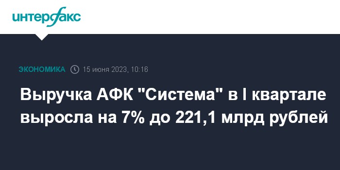 Москва. 15 июня. INTERFAX.RU - Выручка ПАО АФК "Система" по итогам I квартала 2023 года составила 221,1 млрд рублей, что на 7% превышает показатель аналогичного периода прошлого года, сообщила корпорация.