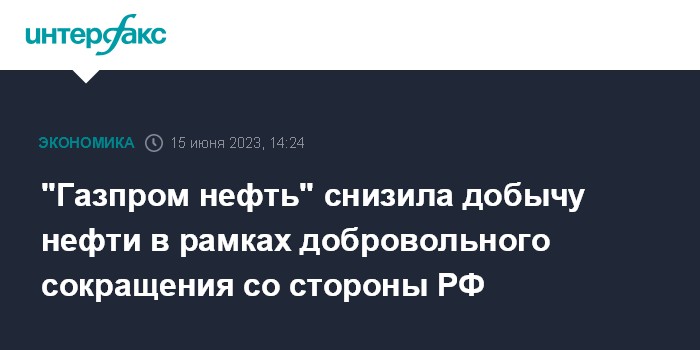 Москва. 15 июня. INTERFAX.RU - "Газпром нефть" сократила нефтепроизводство на необходимый объем в рамках добровольного сокращения Россией общей добычи на 500 тыс. б/с, сообщил журналистам глава компании Александр Дюков в кулуарах Петербургского международного экономического форума (ПМЭФ-2023).