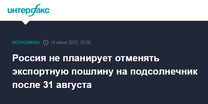 Москва. 15 июня. INTERFAX.RU - Пошлина на экспорт подсолнечника, срок действия которой заканчивается 31 августа этого года, отменена не будет.