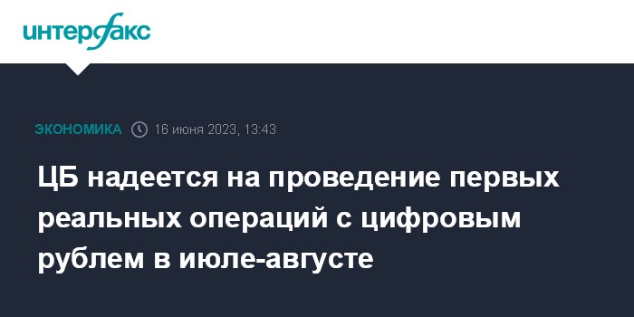 Москва. 16 июня. INTERFAX.RU - Банк России надеется на проведение первых реальных операций с цифровым рублем в июле-августе текущего года, сообщила первый зампред ЦБ Ольга Скоробогатова, выступая на Петербургском международном экономическом форуме.