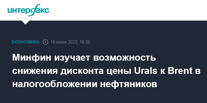 Москва. 16 июня. INTERFAX.RU - Министерство финансов РФ изучает возможность снижения дисконта цены на нефть сорта Urals к Brent в налогообложении нефтяных компаний.