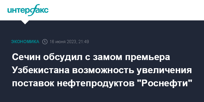 Сечин обсудил с замом премьера Узбекистана возможность увеличения поставок нефтепродуктов "Роснефти"