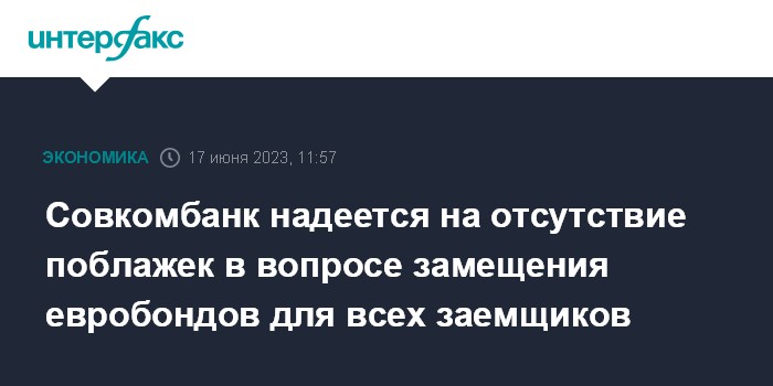 Москва. 17 июня. INTERFAX.RU - Совкомбанк надеется, что правительственная комиссия не будет давать поблажек эмитентам в вопросе обязательного замещения евробондов, заявил "Интерфаксу" первый зампред правления банка Сергей Хотимский в кулуарах ПМЭФ-2023.