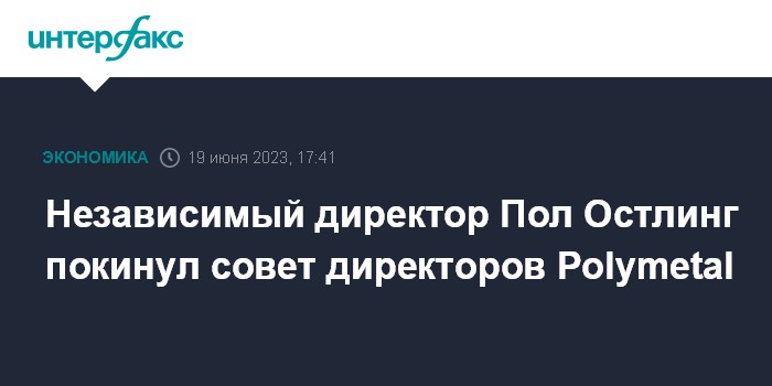 Москва. 19 июня. INTERFAX.RU - Независимый директор Polymetal International plc Пол Остлинг покидает совет директоров золотодобытчика, сообщила компания.