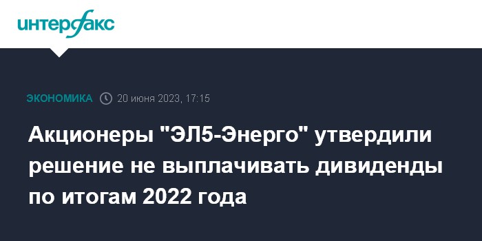 Москва. 20 июня. INTERFAX.RU - Акционеры ПАО "ЭЛ5-Энерго" утвердили решение не выплачивать дивиденды по итогам 2022 года, сообщила компания по итогам прошедшего 20 июня в заочной форме годового собрания.