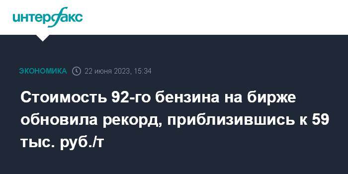 Москва. 22 июня. INTERFAX.RU - Биржевая стоимость Аи-92 по итогам торговой сессии в четверг обновила исторический максимум, достигнув 58 711 руб./т, свидетельствуют данные Санкт-Петербургской международной товарно-сырьевой биржи (СПбМТСБ).
