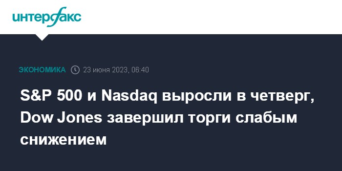 Москва. 23 июня. INTERFAX.RU - Американские фондовые индексы S&P 500 и Nasdaq выросли в четверг, при этом Dow Jones завершил торги незначительным снижением.