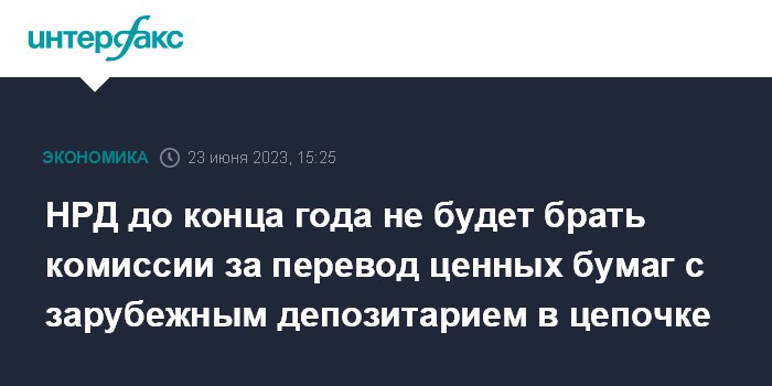 Москва. 23 июня. INTERFAX.RU - Национальный расчетный депозитарий (НРД) продлил до 31 декабря 2023 года маркетинговый период, в течение которого не взимается плата за перевод ценных бумаг российских эмитентов с переходом права собственности, если они учитываются иностранным депозитарием, говорится в сообщении НРД.