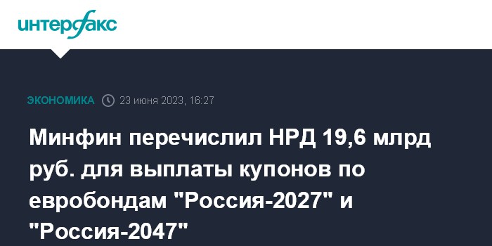 Минфин перечислил НРД 19,6 млрд руб. для выплаты купонов по евробондам "Россия-2027" и "Россия-2047"
