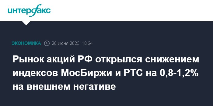 Москва. 26 июня. INTERFAX.RU - Рынок акций РФ открылся в понедельник снижением цен blue chips на фоне негативных сигналов с внешних рынков капитала на опасениях торможения мировой экономики, а также из-за возросших внутриполитических рисков; индексы МосБиржи и РТС за минуту торгов просели на 0,8-1,2% к уровню закрытия основных торгов пятницы.