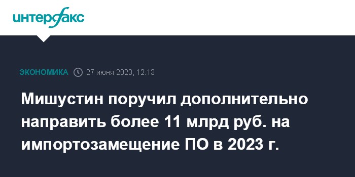 Москва. 27 июня. INTERFAX.RU - Премьер-министр РФ Михаил Мишустин поручил дополнительно направить более 11 млрд рублей на реализацию мероприятий "дорожных карт" развития высокотехнологичных направлений "Новое индустриальное программное обеспечение" и "Новое общесистемное программное обеспечение" в 2023 году. Об этом говорится в перечне поручений по итогам конференции "Цифровая индустрия промышленной России" (ЦИПР).