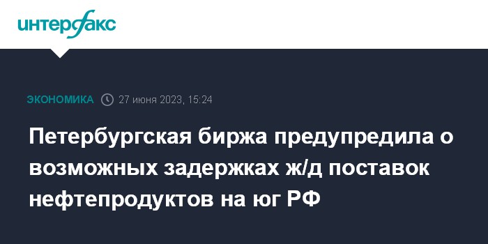 Москва. 27 июня. INTERFAX.RU - Сроки поставок нефтепродуктов на ряд станций юга России могут быть увеличены в связи с инфраструктурными ограничениями на сетях РЖД. Об этом говорится в сообщении Санкт-Петербургской международной товарно-сырьевой биржи (СПбМТСБ).