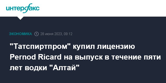 Москва. 28 июня. INTERFAX.RU - АО "Татспиртпром", один из крупнейших производителей алкоголя в РФ, приобрело у российской структуры французского концерна Pernod Ricard (PR) неисключительную лицензию на использование водочного бренда "Алтай" в течение пяти лет, говорится в материалах сайта госзакупок.