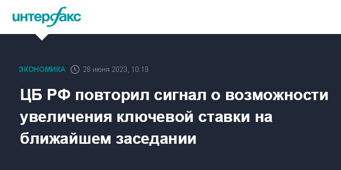 Москва. 28 июня. INTERFAX.RU - Сигнал ЦБ РФ о возможности повышения в июле ключевой ставки, которая с сентября 2022 года держится на уровне 7,5%, озвученный по итогам последнего заседания совета директоров по денежно-кредитной политике 9 июня, остается актуальным.