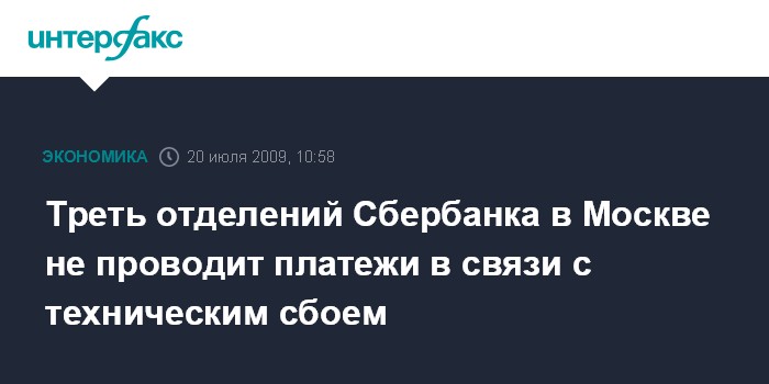 Москва. 20 июля. INTERFAX.RU - Чуть более трети отделений Сбербанка РФ в Москве не проводит платежи в связи с техническим сбоем, сообщила агентству "Интерфакс-АФИ" представитель Сбербанка Ирина Кибина.