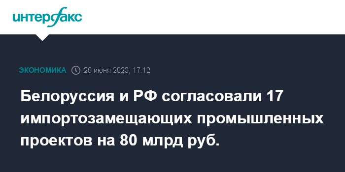 "Беларусь и Россия согласовали 17 интеграционных импортозамещающих проектов на более чем 80 млрд российских рублей", - сказал Харитончик, которого цитирует госагентство БелТА.