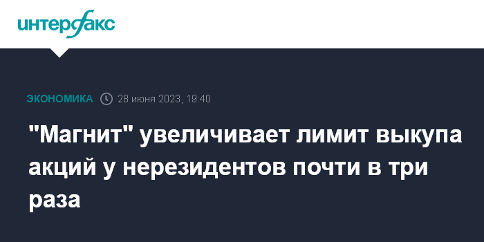 Москва. 28 июня. INTERFAX.RU - Ритейлер "Магнит" увеличивает лимит выкупа акций у инвесторов-нерезидентов до 29,8%, говорится в сообщении компании.
