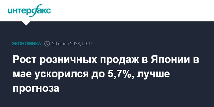 Москва. 29 июня. INTERFAX.RU - Темпы роста розничных продаж в Японии в мае ускорились до 5,7% в годовом выражении, говорится в отчете министерства экономики, торговли и промышленности страны.