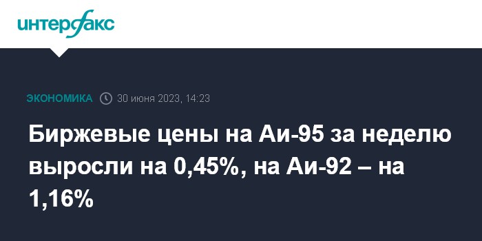 Москва. 30 июня. INTERFAX.RU - Биржевые цены на бензин Премиум-95 увеличились на 0,45% до 64 613 руб./т, на Регуляр-92 – на 1,16% до 58 110 руб./т. Таковы данные Санкт-Петербургской международной товарно-сырьевой биржи (СПбМТСБ) на пятницу по сравнению с показателями понедельника.