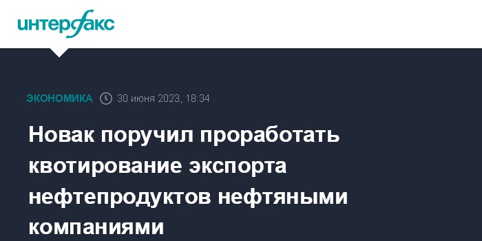 Москва. 30 июня. INTERFAX.RU - Заместитель председателя правительства Александр Новак по итогам совещания по ситуации на рынке нефтепродуктов, в котором приняли участие представители нефтяных компаний и государственных органов власти, поручил проработать квотирование экспорта нефтепродуктов нефтяными компаниями. Об этом сообщается в пресс-релизе на сайте правительства.
