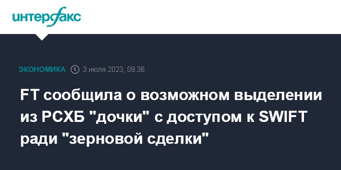 FT сообщила о возможном выделении из РСХБ "дочки" с доступом к SWIFT ради "зерновой сделки"