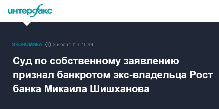 Москва. 3 июля. INTERFAX.RU - Арбитражный суд Московской области в понедельник по собственному заявлению признал несостоятельным (банкротом) бывшего основного владельца Рост банка Микаила Шишханова.