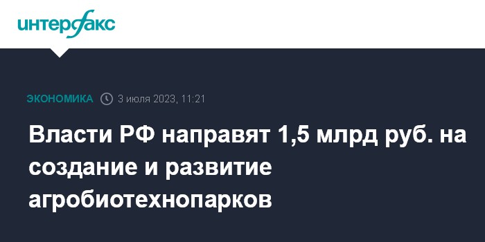 Москва. 3 июля. INTERFAX.RU - Правительство РФ запускает программу господдержки создания и развития агробиотехнопарков. Объем грантов в этом году составит свыше 1,5 млрд рублей.