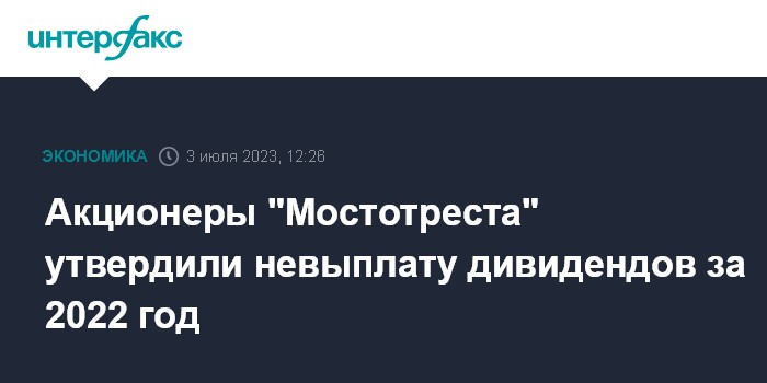 Москва. 3 июля. INTERFAX.RU - Годовое собрание акционеров ПАО "Мостотрест" утвердило рекомендацию совета директоров группы не выплачивать дивиденды за 2022 год, сообщила компания.