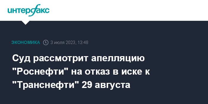 Москва. 3 июля. INTERFAX.RU - Рассмотрение апелляционной жалобы "Роснефти" на решение об отказе в удовлетворении иска к "Транснефти" на 3,4 млрд рублей перенесено с 27 июня на 29 августа, следует из картотеки суда.