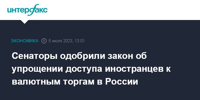 Москва. 5 июля. INTERFAX.RU - Совет Федерации одобрил закон, который позволяет банкам и брокерам из стран, являющихся внешнеторговыми партнерами России и не входящих в ЕАЭС, участвовать в организованных торгах иностранной валютой и производными финансовыми инструментами (ПФИ), базисным активом которых являются валюта и процентные ставки.
