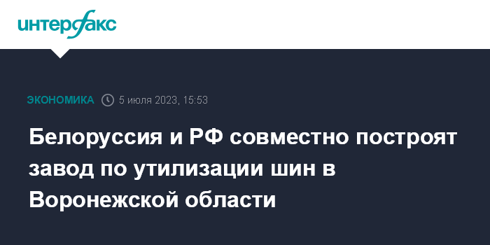Москва. 5 июля. INTERFAX.RU - Белоруссия и Россия договорились о постройке в Воронежской области РФ завода по утилизации шин. Об этом сообщило корпоративное издание "Вестник Белнефтехима".