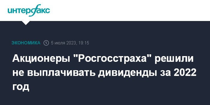 Москва. 5 июля. INTERFAX.RU - Акционеры ПАО СК "Росгосстрах" решили не выплачивать дивиденды по итогам 2022 года, оставив чистую прибыль нераспределенной, следует из материалов раскрытия.