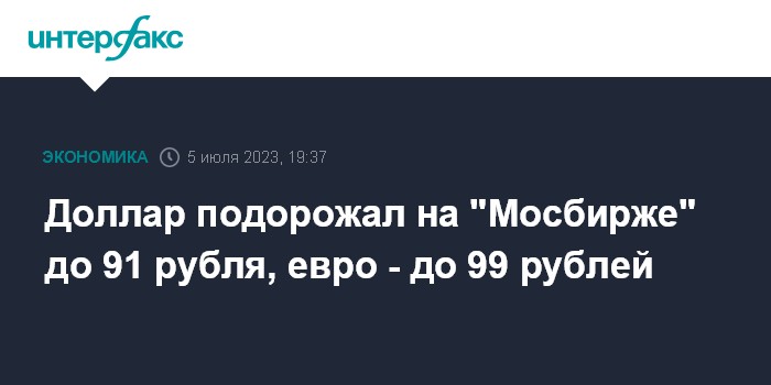 К 19:00 доллар подорожал на 1,82 рубля, до 91 рубля. Курс поднялся к 91 рублю впервые с 28 марта 2022 года. Евро к этому времени подорожал на 1,76 рубля, до 99 рублей. Евро достиг 99 рублей впервые с 29 марта 2022 года. Бивалютная корзина ($0,55 и 0,45 евро) подорожала на 1,79 рубля - до 94,6 рубля. Курс китайского юаня вырос на 20,9 копейки - до 12,54 рубля. Юань поднялся выше 12,5 рубля впервые с 19 апреля 2022 года.