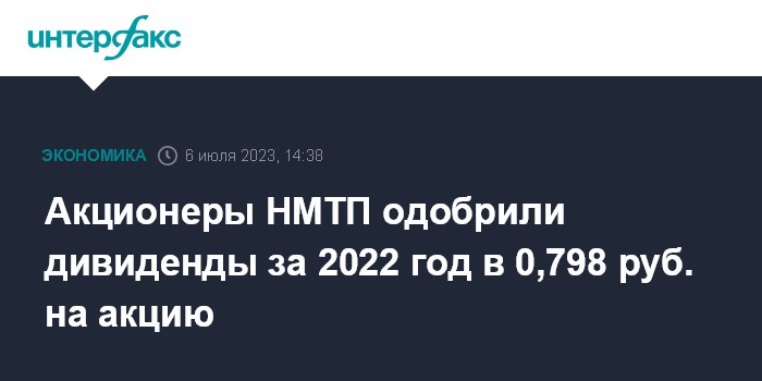 Москва. 6 июля. INTERFAX.RU - Акционеры "Новороссийского морского торгового порта" (НМТП) на годовом собрании 30 июня одобрили выплату дивидендов в размере 0,798 рубля на акцию по итогам 2022 года, говорится в сообщении компании.