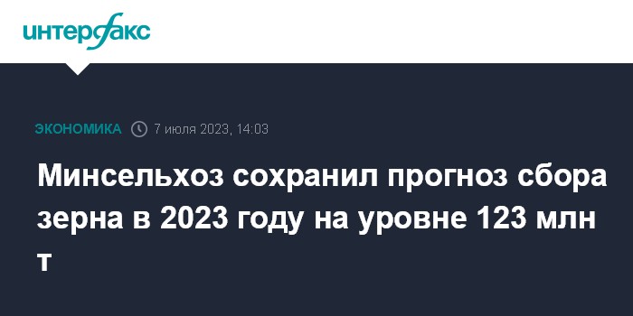 "Пока мы придерживаемся того же объема в прогнозах производства (зерна в 2023 году - ИФ) в 123 млн тонн. Из них 78 млн тонн должно быть пшеницы. Но дальше все будет зависеть от того, как будет идти уборка, от климатических условий. Возможно, нам через какое-то время предоставится возможность скорректировать урожай в сторону повышения", - сказал Патрушев.