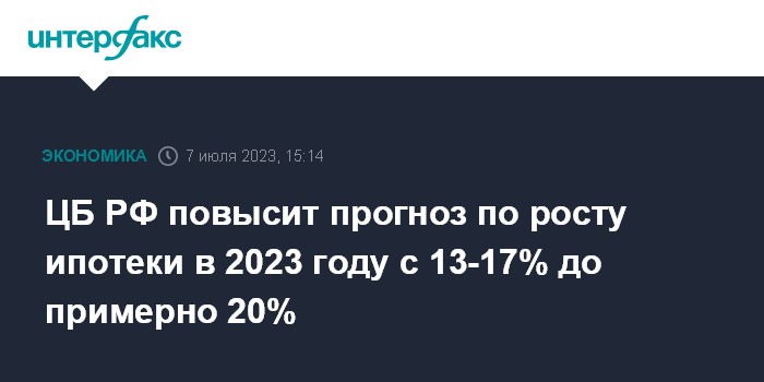 Москва. 7 июля. INTERFAX.RU - Банк России в июле обновит свой прогноз по динамике ипотеки в 2023 году, так как ожидает более существенного роста - примерно на 20% - по сравнению с текущим прогнозом в 13-17%.
