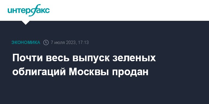 Москва. 7 июля. INTERFAX.RU - Выпуск биржевых зеленых облигаций Москвы, размещение которого началось 30 мая, продан почти в полном объеме, сообщила глава столичного департамента экономической политики и развития города Мария Багреева.