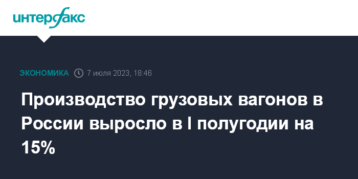 Москва. 7 июля. INTERFAX.RU - Российские предприятия, по предварительным данным, увеличили в январе-июне 2023 года производство грузовых вагонов на 15% в годовом измерении, до 28 282 штук. Данные представлены НП "Объединение производителей железнодорожной техники" (ОПЖТ).