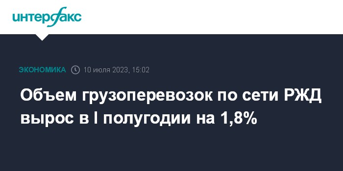 Москва. 10 июля. INTERFAX.RU - Объем перевозок грузов по сети ОАО "Российские железные дороги" вырос в январе-июне 2023 года в годовом исчислении на 1,8%, до 685,14 млн тонн, говорится в материалах компании, с которыми ознакомился "Интерфакс".