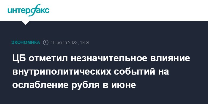 "При этом внутриполитические события в конце месяца (23 - 25 июня) оказали незначительное влияние на его месячную динамику", - считает Банк России.