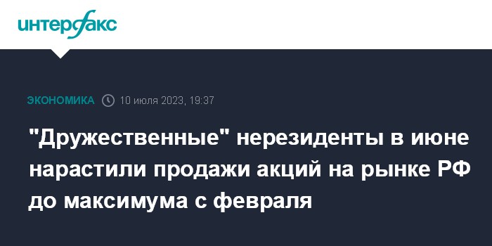 Москва. 10 июля. INTERFAX.RU - Нерезиденты из "дружественных" юрисдикций в июне, последняя неделя которого ознаменовалась для российского рынка стрессом из-за попытки военного мятежа, заметно активизировали продажи акций.