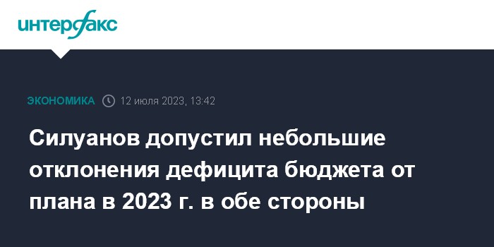 Москва. 12 июля. INTERFAX.RU - Небольшие отклонения дефицита федерального бюджета от планового уровня в 2% ВВП по итогам 2023 возможны в обе стороны, полагает министр финансов РФ Антон Силуанов.