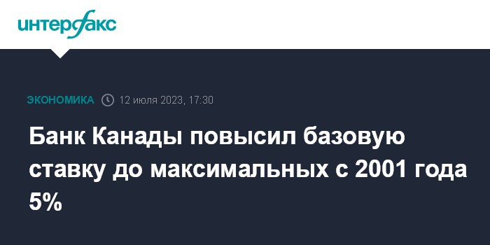 Москва. 12 июля. INTERFAX.RU - Банк Канады повысил ключевую процентную ставку на 25 базисных пунктов (б.п.), до максимальных с 2001 года 5% годовых. Решение регулятора совпало с ожиданиями рынка.