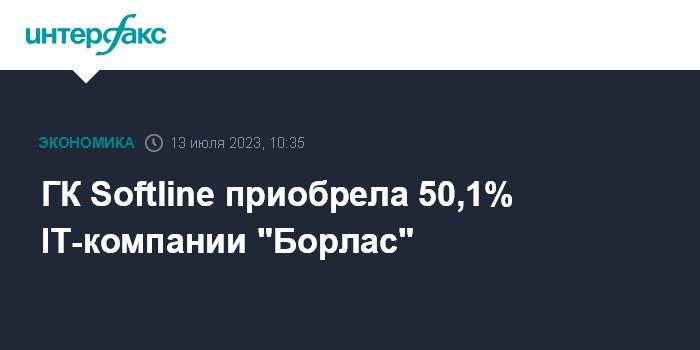 Москва. 13 июля. INTERFAX.RU - ГК Softline закрыла сделку по приобретению 50,1% доли в ГК "Борлас", говорится в сообщении Softline. Сумма сделки не раскрывается.