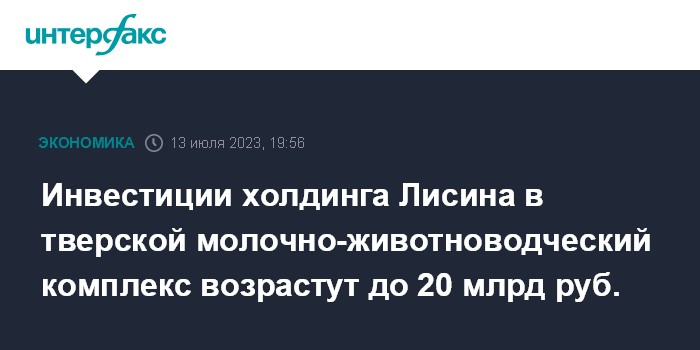 Инвестиции холдинга Лисина в тверской молочно-животноводческий комплекс возрастут до 20 млрд руб.
